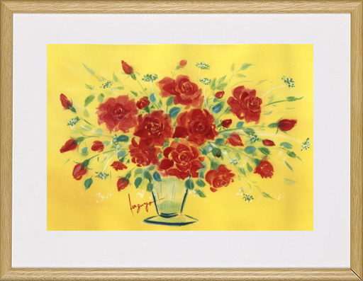 金運と縁が深い色、黄色を背景に薔薇の赤い花びらは活力を感じていただけるように描かれています。