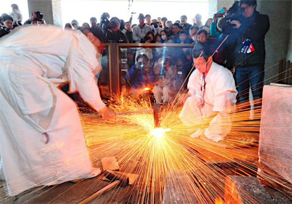 岐阜県関市で2日行われた、刀匠の仕事始め「打ち初め式」。