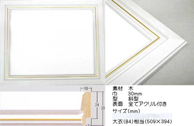 絵サイズ : B4 / 額内寸 : 509x394mm / 額素材 : 木 / 額巾 : 30mm / 額厚 : 15mm / 額色 : ホワイト×ゴールド / 表面 : アクリル