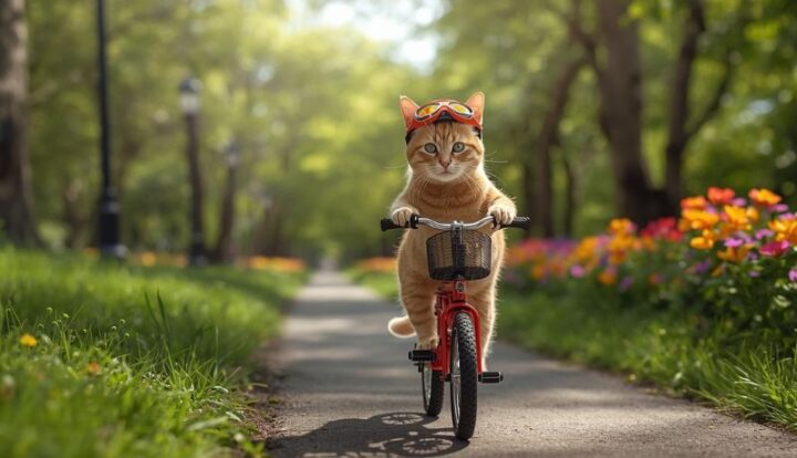 猫は赤いゴーグルをつけて、花咲く公園の小道を軽快に走る姿。