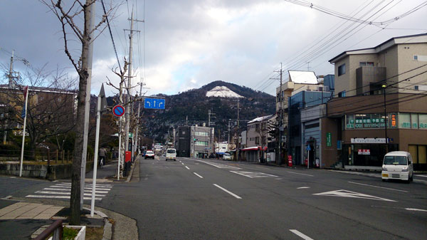 加茂川の堤防を車で走っていると、雪に塗れた大文字山の景色が目に入ってきました。